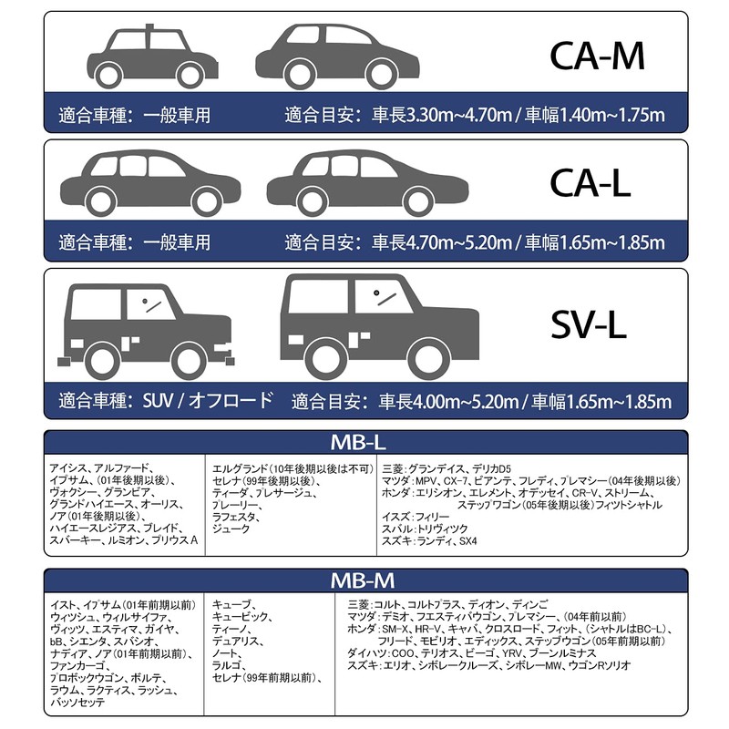 - Compatible Sizes: Compatible Models: General passenger cars. Compatibility Guidelines: Vehicle Length 15.4 - 17.1 feet (4.70 - 5.20 m) / Vehicle Width 5.4 - 6.1 feet (1.65 - 1.85 m)