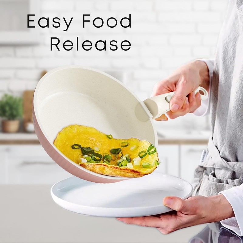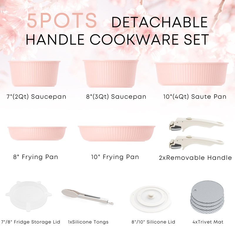 Caannasweis Detachable Nonstick Cookware Set - Stackable Induction Pots and Pans With Removable Handles, Dishwasher Safe - For RV Camping, Oven and Stovetop Use, 5 Pieces (Petal)