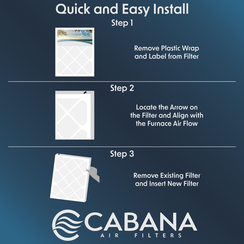 - Long-lasting Filtration & Easy Installation with Cabana Air Filters: Experience up to 3 months of effective filtration, depending on your air quality. In areas with higher pollutants, you may need to change your filters monthly. Enjoy effortless replacements for air conditioning units or HVAC systems—just follow the airflow arrows and insert into the filter slot for central units or return grilles!