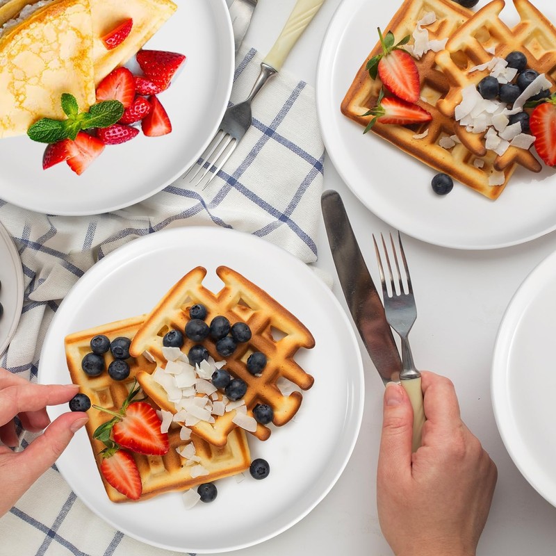 • Porcelain White Dinner Plates: These ceramic plates feature a classic round shape and rim, and the simple white plates complement the existing tablecloth and surrounding decor, adding a touch of elegance to any table
