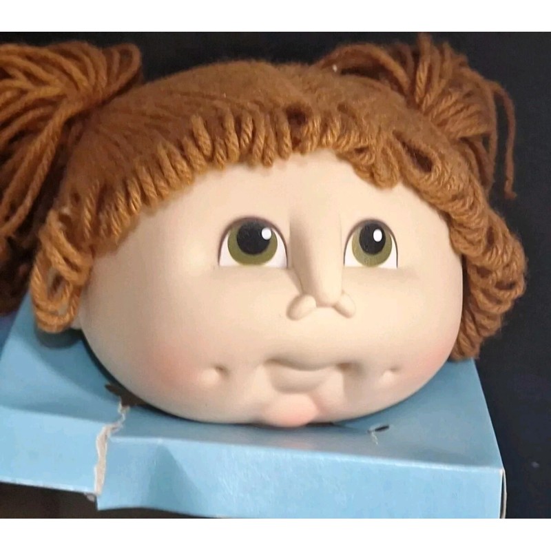This is a vintage Cabbage Patch Kids baby doll head from 1984, designed by Martha Nelson Thomas. The doll has red straight hair styled in pigtail, hazel eyes, and a light complexion. It is made of plastic and rubber, and comes in its original box. This doll head is an original piece from the CPK franchise, representing a girl doll with a unique appearance.
