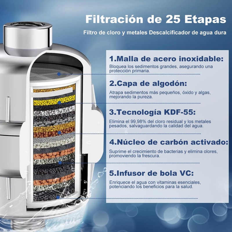 - 【Tecnología de Filtración Superior】 Experimente un nivel de pureza superior con nuestra alcachofa de ducha con tecnología de filtración avanzada. El nuevo cabezal de ducha con filtración de 25 etapas, filtrado de contiene una versión mejorada de Carbón Activado de alto grado, Vitamina C y Bolas Minerales/Cerámicas, elimina eficazmente hasta el doble de metales pesados, cloro y cloraminas del agua del grifo, garantizando una rutina de baño más saludable. Reduzca la piel seca con picazón, y mejora la condición de su piel, cabello y uñas tanto en agua caliente como fría.
