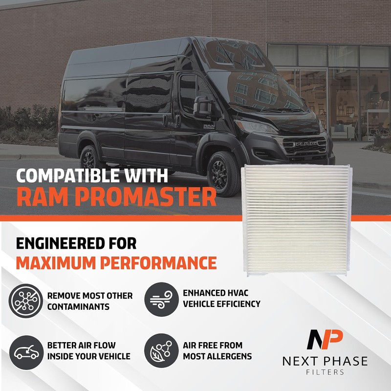 If you are looking for a way to improve the quality of air inside your vehicle, then look no further. Next Phase Cabin Filters can help you achieve healthier and cleaner air inside your vehicle. Next Phase cabin filters are made of top-notch materials that effectively prevent air impurities, odors, and other harmful particles from entering your cabin, so you can breathe in nothing but fresh and clean air. Our cabin filters are made in accordance with manufacturer standards so you can be assured that they will provide the same exceptional quality and performance as the original part. Our cabin filters are easy to install and fit right out of the box. Your Next Phase cabin filter can help extend the life span of your vehicle's HVAC system and improve the overall performance of your car by keeping your air conditioning system in excellent condition. This can help you save money and reduce the likelihood of costly maintenance in the future. We have customized our cabin filters to fit specific vehicle makes and models. The NP21521 replaces O.E. 68103578AA; Wix WP9320, Purolator C21521, Champ CAF1954. They are compatible with 2015-2023 Ram ProMaster City 2.4L; 2007-2012 Fiat Linea 1.4L; 2014-2015 Suzuki Swift 1.6L. Our priority is to deliver premium filters that meet our customers’ standards. We take pride in our American-made premium filters that not only provide quality performance but are also insanely affordable.