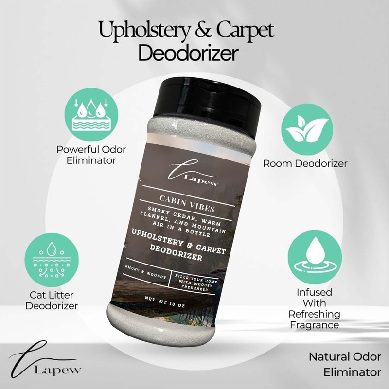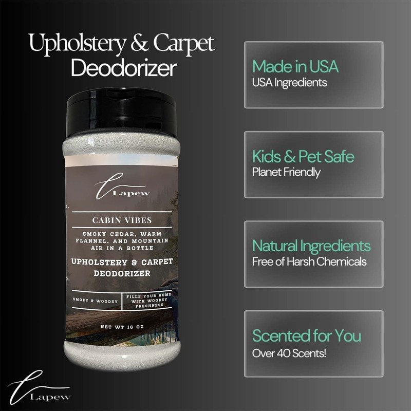 Discover the invigorating scents of Lapew's Upholstery Deodorizers. Infused with simple, natural ingredients, this 16 oz deodorizer is free from harsh chemicals, providing clean freshness for your home. Ideal for various surfaces such as upholstered furniture, carpets, pet areas, and more, it ensures long-lasting revitalization. To use, lightly sprinkle over the desired area, let it work for 20 minutes, and vacuum away for a renewed, clean aura. Made in the USA, it's safe for people, pets, and the planet.