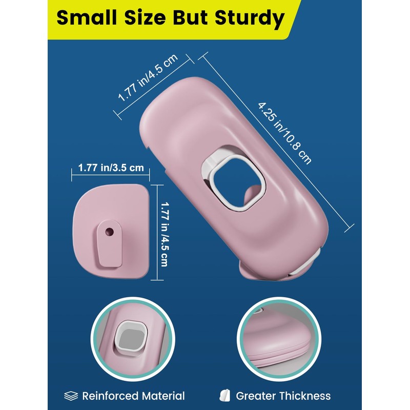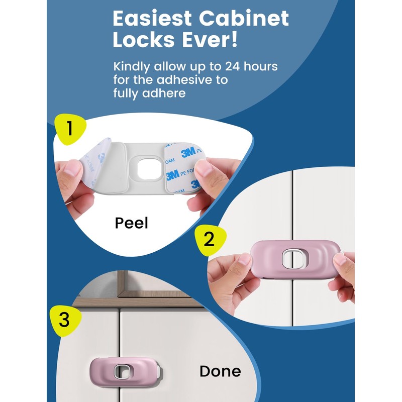 - 🍑【Simple Installation & Compact Size】 Installation of this baby cabinet locks requires no tools – simply peel off the adhesive, place it in position, and you're done! (For better performance, let it sit undisturbed for 24 hours before use.) The compact product dimensions make it suitable for use on cabinets, drawers, wardrobes, food cabinets, refrigerators, and more, like magic, transforming your life!