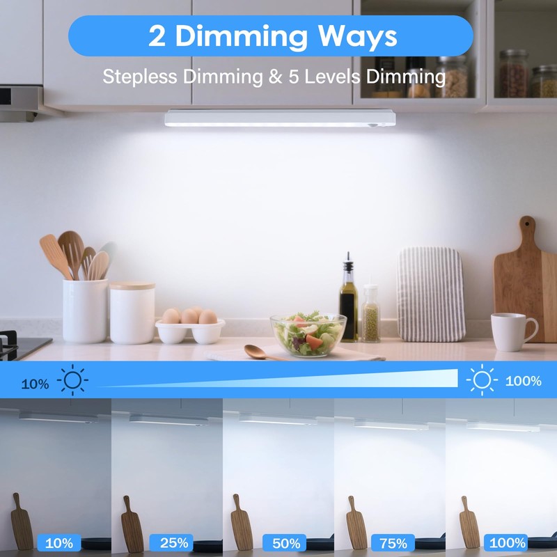 - Multi Level Dimming Mode This LED kitchen under unit light supports five-level dimming (100%/75%/50%/25%/10%) and stepless dimming mode, with sensitive buttons and easy adjustment. Light bar kitchen meet the lighting requirements of different usage scenarios such as kitchens, bedrooms and wardrobes. Users can freely adjust the brightness according to the actual light requirement to create a more comfortable and energy-saving user experience.