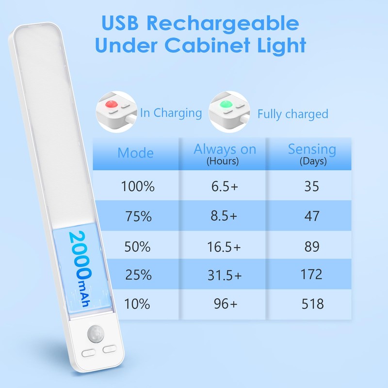 - LARGE CAPACITY RECHARGEABLE BATTERY The under-unit kitchen LED light is equipped with a powerful 2000mAh battery, supports USB fast charging and full charging takes only 3-4 hours. At 100% brightness, the kitchen under-unit light is ready to use in continuous light mode for 6.5 hours and in induction mode 35 days. 10% brightness can last for 96 hours in constant light mode and 518 days in induction mode (10 times/day).