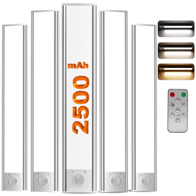 Cabinet Lighting LED with Remote Control and Motion Sensor, 20 cm Base Cabinet Lighting, 2500 mAh, 2 Modes, 3 Colours, 3000 K - 6000 K, Under-Unit Light, Wireless Light Strip, Kitchen, Pack of 5