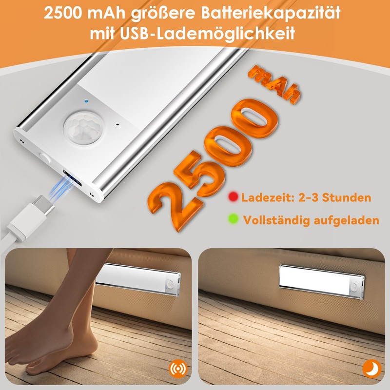 - Under-unit light with super strong 2500 mAh battery and high-quality lamp beads: 2500 mAh battery. In sensor mode, depending on the frequency of use and light intensity, can be used for 7-60 days (depending on the frequency of use and brightness). The continuous operating time is approx. 10-12 hours. We use high-quality eye-friendly lamp beads that reach a maximum lumen value of up to 150 lm (different depending on the mode), so you have a better view in the kitchen when cooking or in the cupboard/office room.
