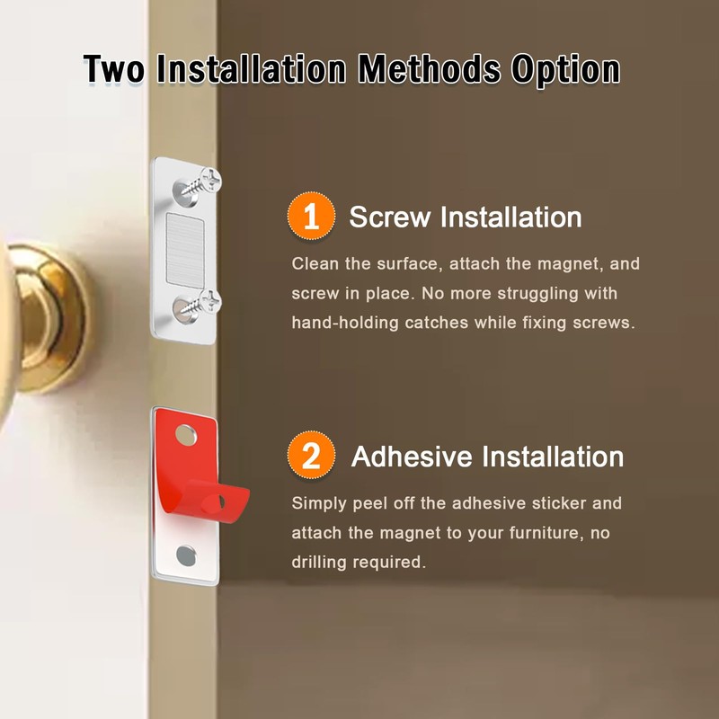 - Powerful Adhesive: The double-side adhesive tape is strong enough to stay cabinet shut without drilling screw holes to screw it in.Time saving and also protect your expensive cabinet from damage. Also provide screws for your installation. Please close and open the door after 12 HOURS in order to make the adhesive compound adhere well on this surface.