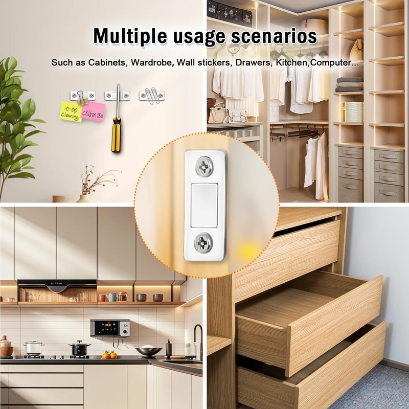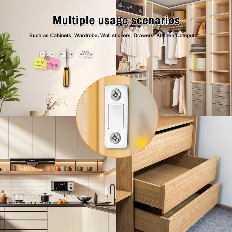 - Long-Lasting Durability: These flat magnets for cabinets are made of metal material, against corrosion, cracking, more durable and long lasting than the plastic one. The cabinet door closers also come with stainless steel mounting high quality screws. You don't need worry about the screw will easily broken on installation process again.