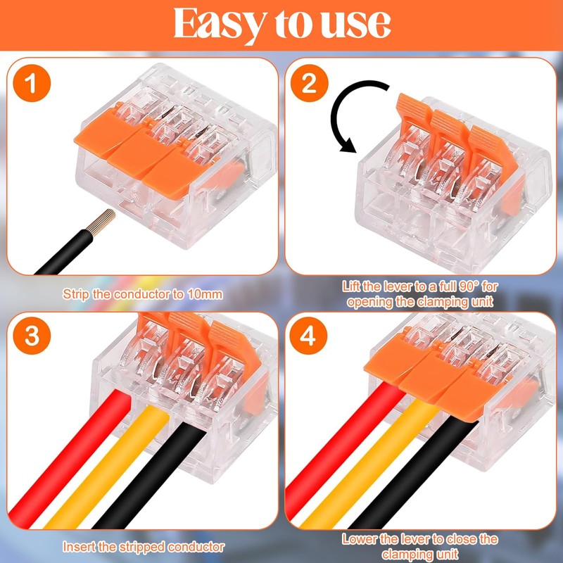 - Easy to use, quick wiring: each wire connection has its own actuation lever, and each wire can be independently managed for easy installation and disassembly. Built-in test points, no disassembly required for testing, speeds up wiring.