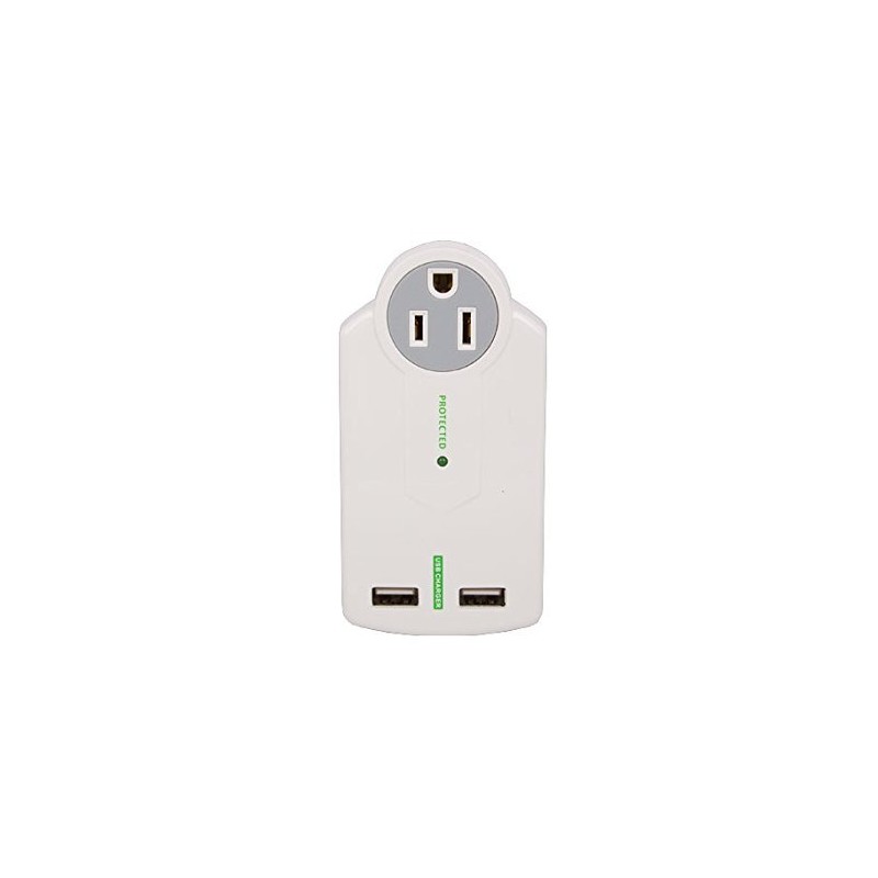 Charge your favorite mobile devices from this stylish compact surge protector with build-in USB charger! This surge protector is designed to attach to a wall outlet, providing three protected AC outlets and two USB charger ports with a total capacity of 2.1 Amps. The plug is foldable for easy storage and prevents damage.