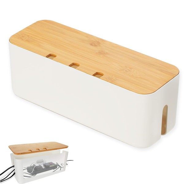 Cable Management Box, Larger Cable Tidy Box Cord Organizer Boxes with Bamboo Lid Cables Organised Boxes Includes Cables Ties Reusable Straps for Hiding Messy Wire Management