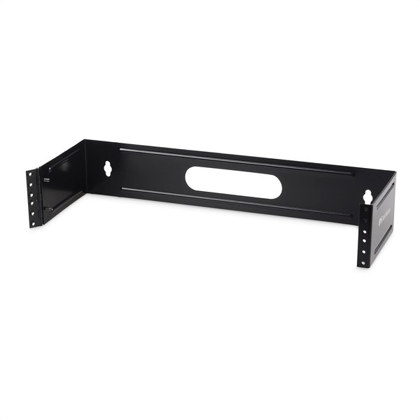 The Cable Matters 2U Hinged 19” Wall-Mount Panel Bracket is a great option for mounting patch panels or slim equipment without a rack or cabinet. Designed for wall-mounting standard 19” patch panels with 2U (3.5”) height, with a universal left or right mount hinge and rear cut-out for routing cable through the wall. The black-painted steel bracket has reinforcement ribs and screw keyholes spaced at 16" for durable and secure support.