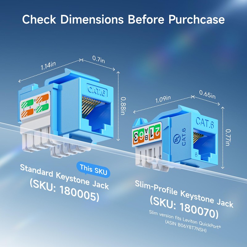 - Cat 6 RJ45 Heavy duty keystone jacks fit patch panels, wall plates, or surface mount boxes with standard keystone blank openings; Accepts 23 and 24 AWG unShielded twisted pair (UTP) cable