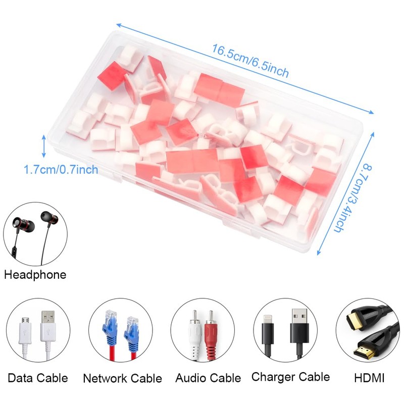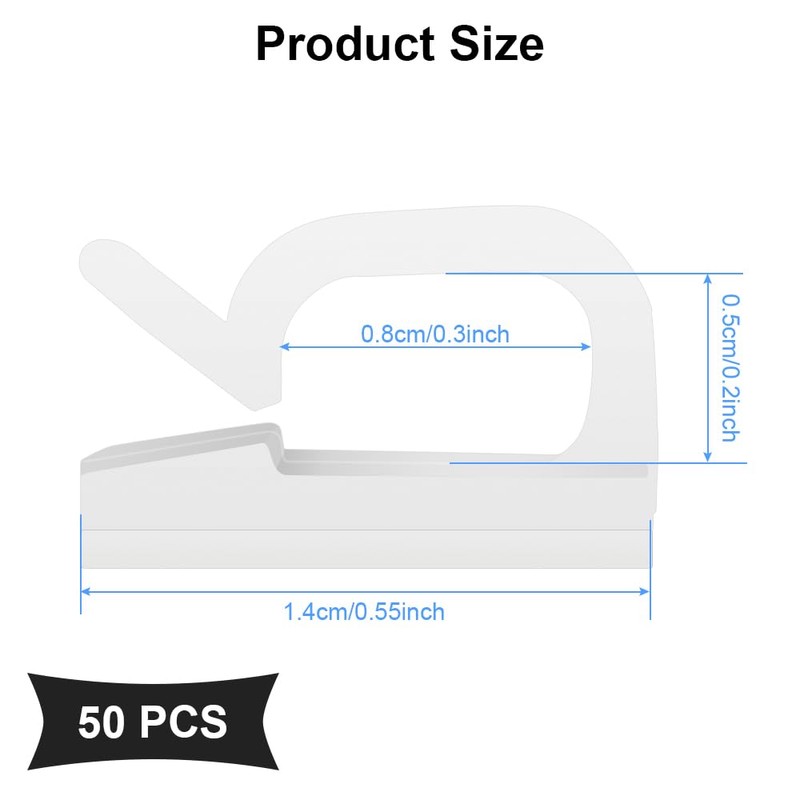 • VALUE PACKAGE: 50 cable clips per box Length 14 mm/0.55 inch, width 15 mm/0.55 inch, height 9 mm/0.35 inch; suitable for cable diameters up to 5 mm/0.2 inch, suitable for most cables and small enough to save space. No need to drill or screw, just detach and attach to keep your home tidy.