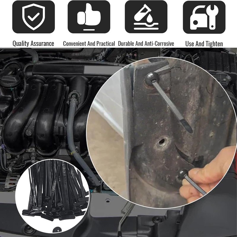 Perfect for car daily fixing, these zip ties can securely hold wires, cables, and other items in place. The universal design ensures compatibility with a wide range of uses, from automotive to home and garage projects. The self-locking mechanism enables quick installation without the need for additional tools.