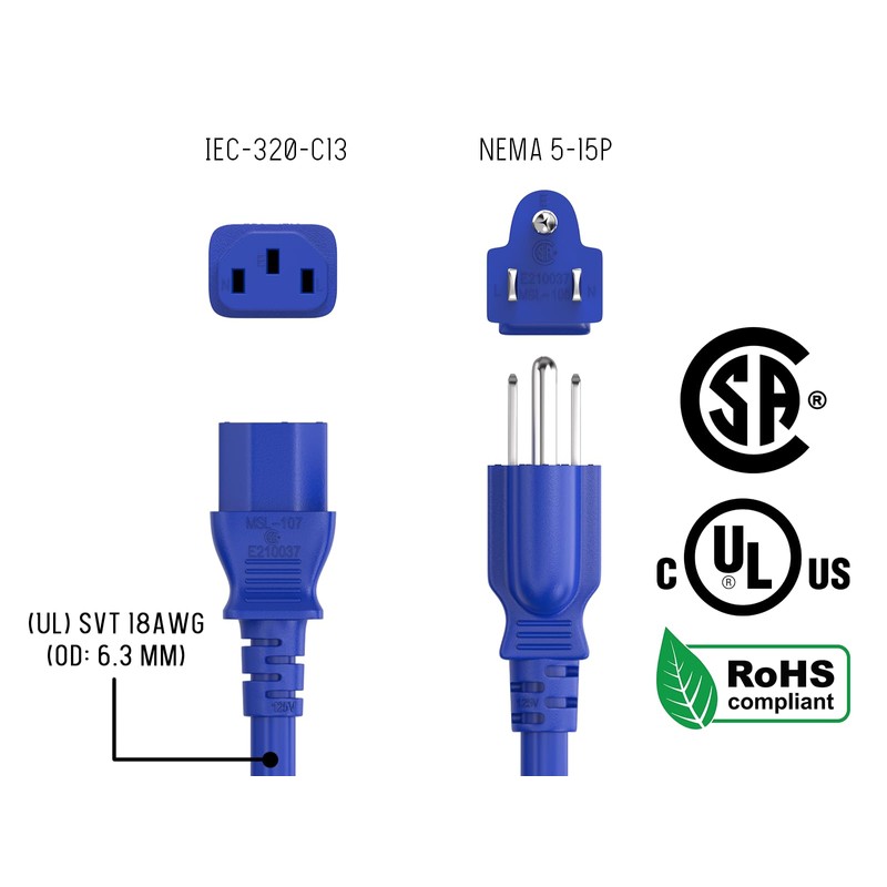 CableLeader 4ft 14 AWG Universal Power Cord IEC320 C13 to NEMA 5-15P, Extension Power Cord, Compatible with Computers, Monitors, Printers & TVs, Blue, Pack of 1