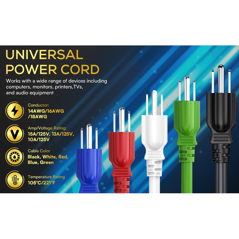 - UNIVERSAL COMPATIBILITY: Works with a wide range of devices featuring IEC-60320-C14 inlets, including computers, monitors, printers, TVs, and audio equipment
