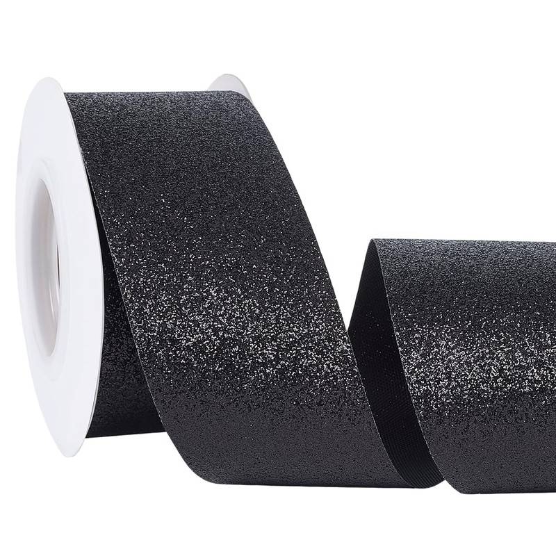 - Black Glitter Ribbon: This glitter sparkle ribbon, in classic black, is contrasted with glitter particles, retaining the calm and mystery of black while adding luxury and sparkle, a perfect blend that gives your party decorations and garlands an unmistakable aesthetic appeal
