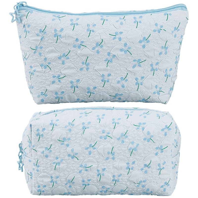 - Blue Floral Makeup Bag Set: These blue floral cosmetic pouch feature a charming flower pattern and light sky blue color, combining fashion with functionality. The zipper closure ensures secure storage for your makeup and toiletries