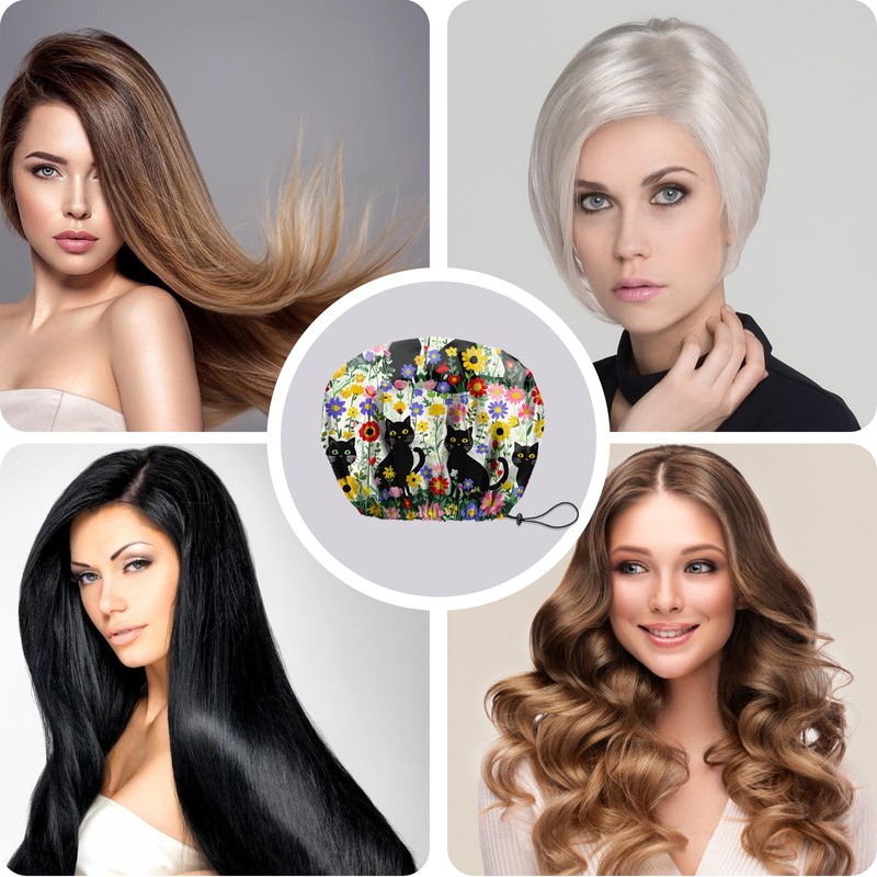 Cabreche 2 PCS Shower Cap Reusable Waterproof Double Layers Hair Caps Large Shower Bath Adjustable Elastic Hat for Women Girls Cute Aesthetic-Flower Black Cat