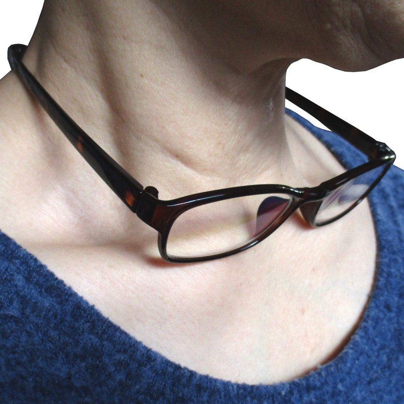 - 首にかかる老眼鏡。ツルが長いので、しっかりホールドしズレにくく快適な使い心地。ツルの先に滑り止めゴムが付き、従来品より首にかけた時の安定感が向上。