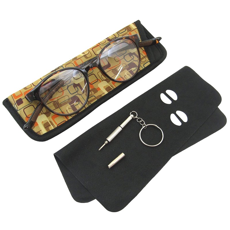 - ■付属品■ 専用片口ソフトケース、汚れを拭き取りやすいスエードメガネクロス、ねじが緩んだ時のミニドライバー、フィット感が良くなるシリコン鼻パッド。