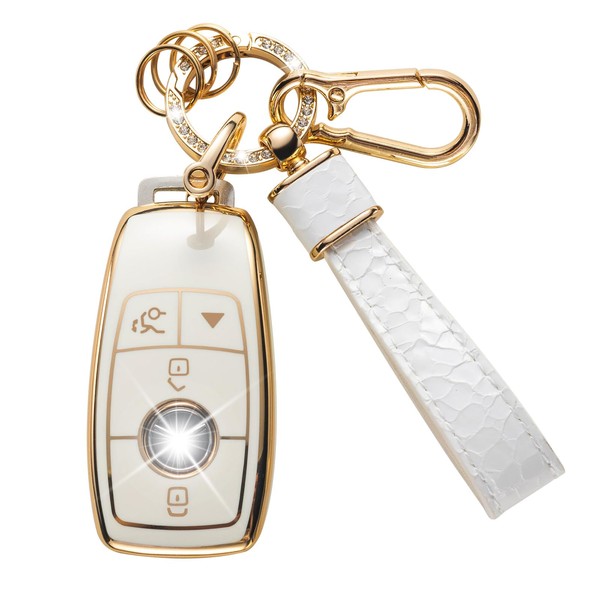 - 【Multifunctional Car Keychain】: Include 1 Benz key fob case, 1 leather lanyard , 1 shiny crystal metal clip with extra 3 rings, 1 anti-lost D-shape buckle and 1 carabiner clip to hook it on belt. Bling gold car keychain holder suitable for car keys, work keys, family keys, pocket accessories and pendant.