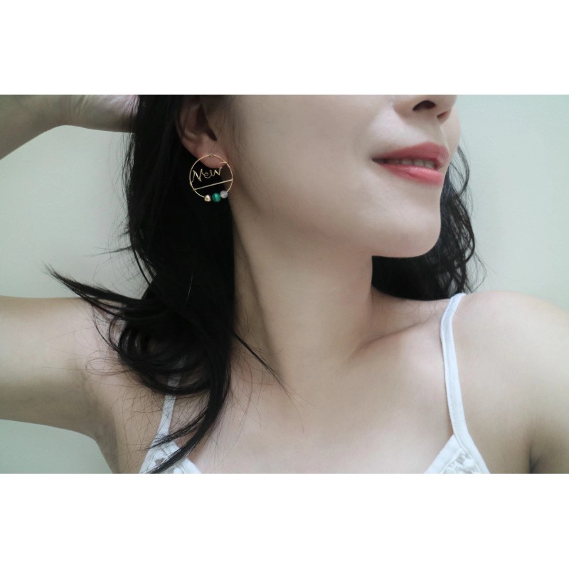 Cachito Studio Custom Word Earrings in 14k Gold w. Peacock Stone, Moonstone, & 14k Gold Sphere
