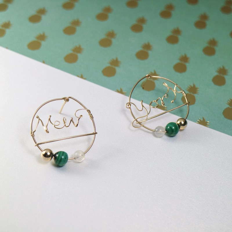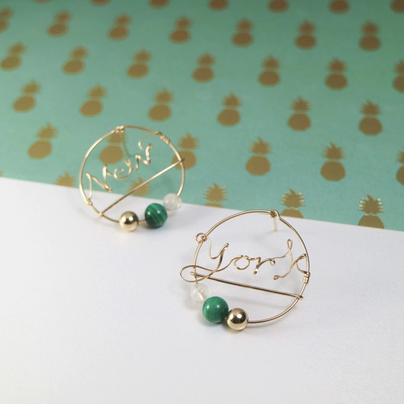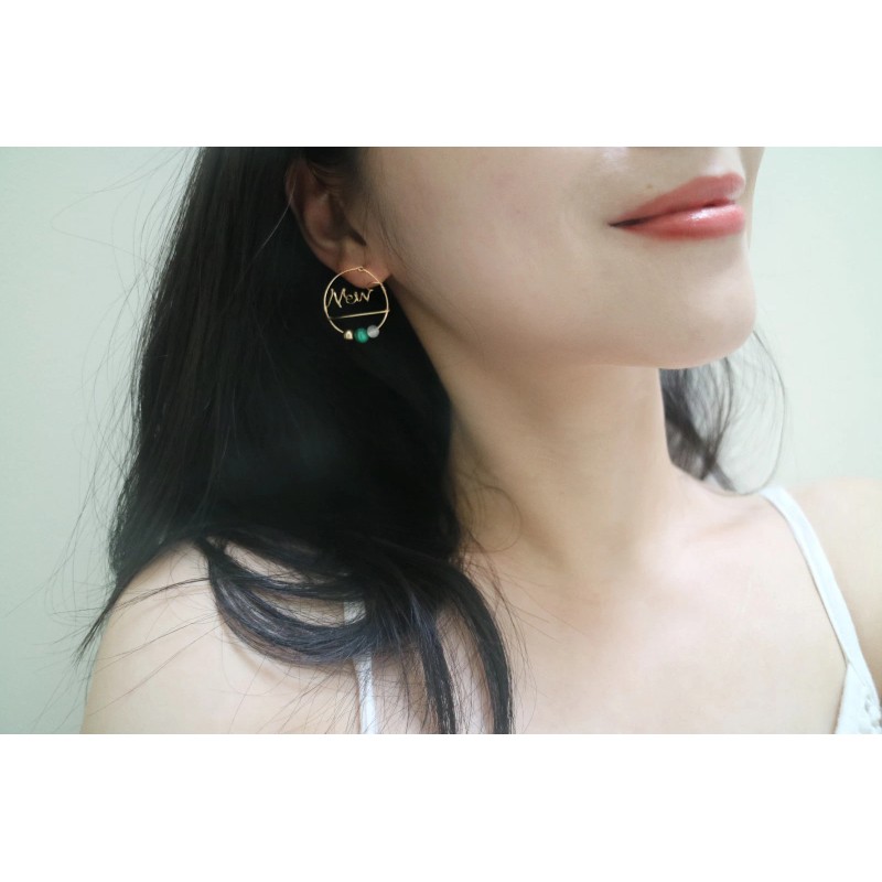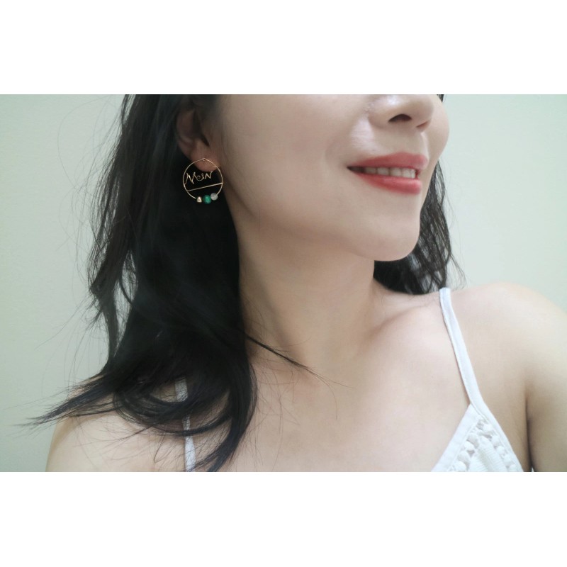 Cachito Studio Custom Word Earrings in 14k Gold w. Peacock Stone, Moonstone, & 14k Gold Sphere
