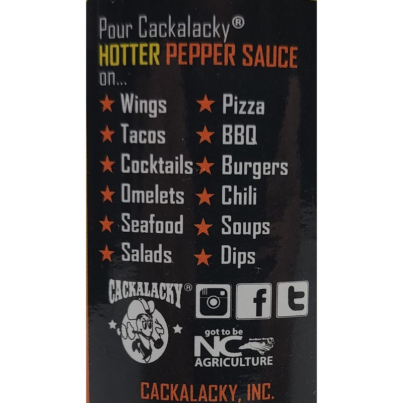 - Cackalacky Super Extra Hot Pepper Sauce is, as its name suggests, an extra-spicy version of our flagship gourmet Cackalacky Pepper Sauce.