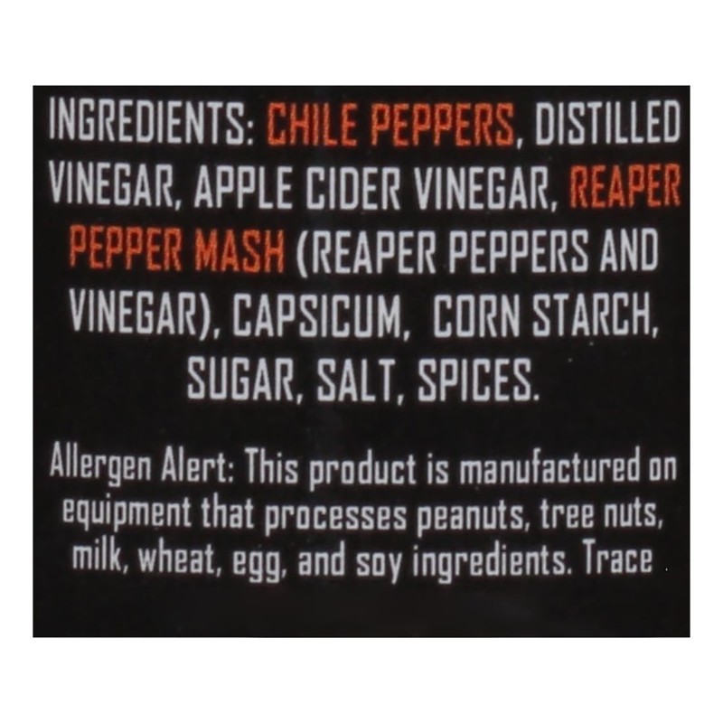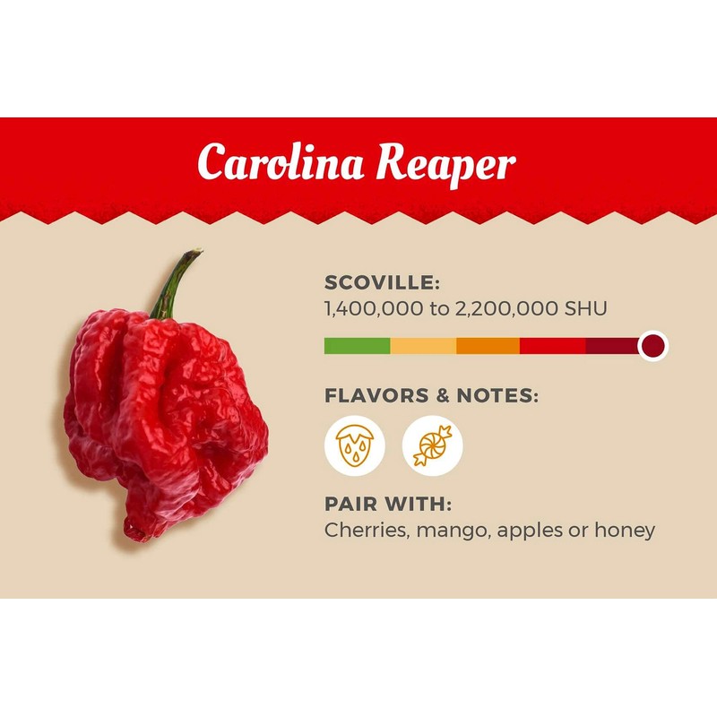- Approximately 1,642,000 – 2,500,000 Scoville Heat Units with subtle notes of sweetness and fruity flavors. The Carolina Reaper chile pepper, the primary source of this sauce’s extraordinary piquancy, is the perfect candidate to provide this offering with its superlative heat and taste sensations.