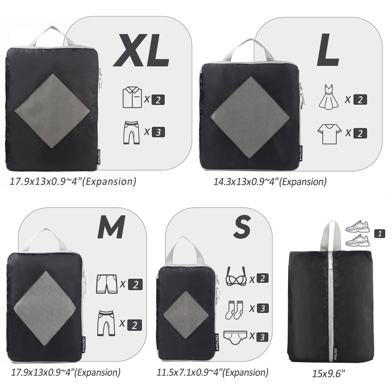 CaCTOUR Compression Packing Cubes for Travel,Expandable Packing Cubes for Suitcases, 5 Set Lightweight Compression Travel Cubes, Luggage Packing Organizers Bags Set, Travel Accessories (Black)