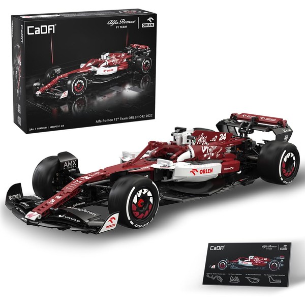 • CaDA C64005W Alfa Romeo F1 Building Blocks Matching set: Based on the prototype design of Alfa Romeo F1 Team's new car C42 for the 2022 season. Has a perfect ratio of 1:8; The entire car contains 1,868 blocks and is rich in detail, recreating the stunning design of the real car.