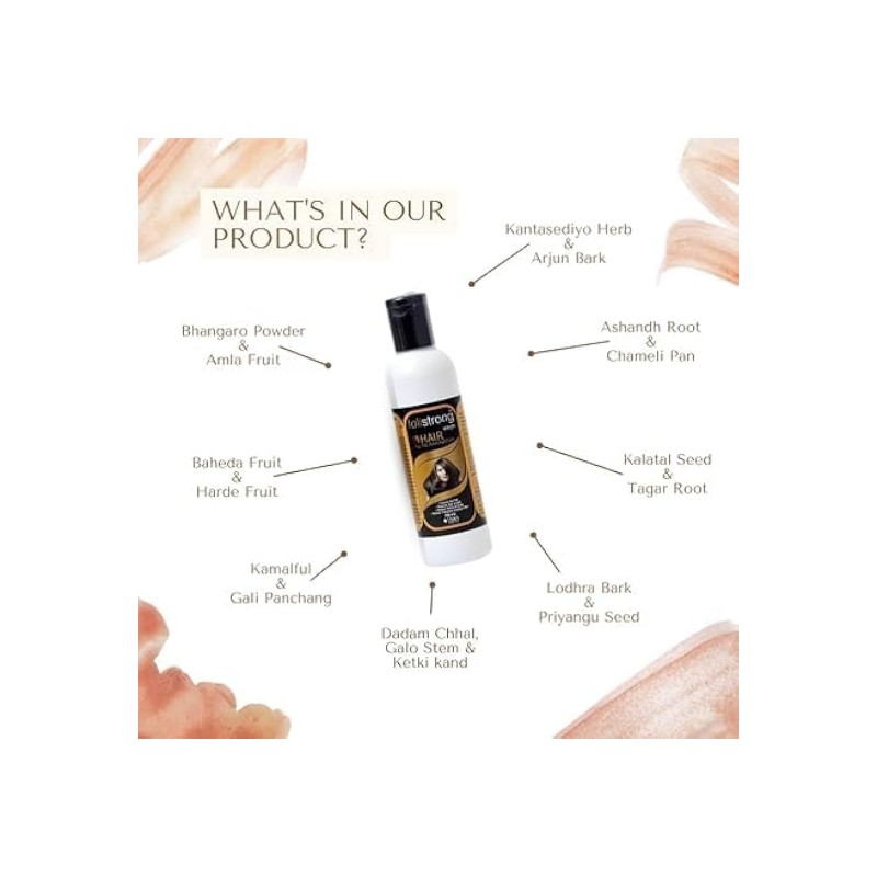 TIL OIL, BHANGRO HERB POWDER, AMLA FRUIT, BAHEDA FRUIT, HARADE FRUIT, KAMAL FUL, GALI PANCHANG, KANTASEDIO HERB, ARJUN BARK, ASHANDH ROOT, CHAMELI PAN, KALATAL SEED, TAGAR ROOT, LODHRA BARK, PRIYANGU SEED, DADAM CHHAL, GALO STEM, KETKI KAND.
