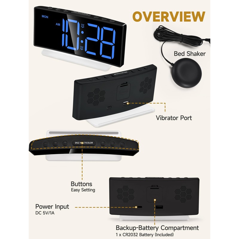 - Easy to Operate: The alarm clock is designed for easy use with intuitive setting buttons, making it suitable for people of all ages, including kids and elders. It features updated functions such as vibration, dual alarm, dimmer, USB charging port, and a modern design, making it a perfect choice for your family, friends, and kids