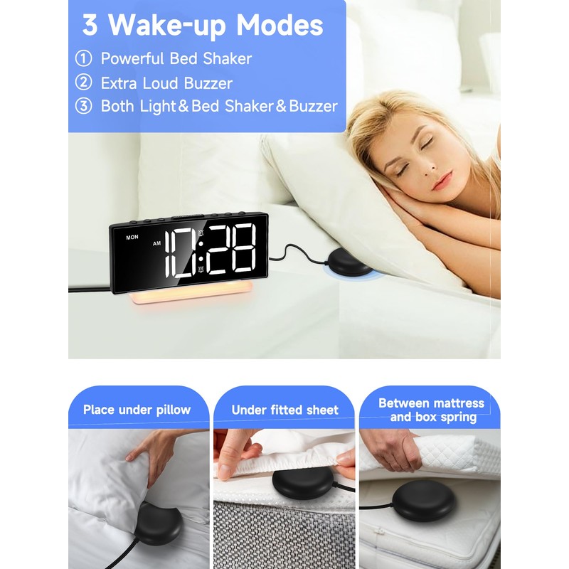 - Strong Wired Vibration Shaker & Adjustable Volume: The clock comes with a 78" long wired bed shaker that can be placed under the mattress to wake you up without disturbing others. With a maximum volume of 105dB and 4 adjustable levels, it is suitable for waking up kids, teens, and students effectively