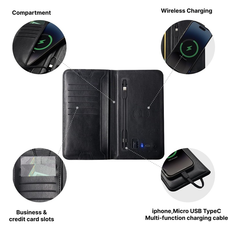- Worried about your phone running out of battery when it’s time to pay? This smart wallet for men and women features a 5000mAh built-in power bank with Type-C, Lightning, and wireless charging. Perfect as a travel wallet, credit card holder, or mens leather wallet, it blends function and style. Ideal for daily use, this slim wallet keeps your phone and essentials powered and organized wherever you go