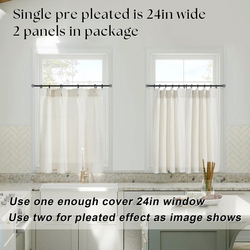 - Product Info & Easy Care: Pack of 2 pieces.Each is 24”wide(width with pleats not like other small curtains on the market).The curtain sets can cover a 48 wide window.For more tailored ruffle pleat effect,4 panels are recommended.Machine washable.No bleach.Tumble dry low.Iron with low settings if wrinkled from package or after washing.