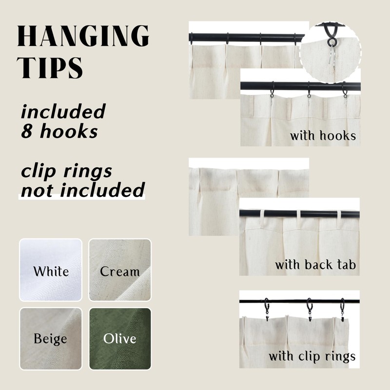 - 3-Way Easy Sliding Hanging Options: Method 1 - With hooks in the pack,simply pin the hooks onto back of curtain as the image shows and pin the other end onto your own curtain rings. Method 2 - If you prefer hiding the tension rod,back tab hanging. Method 3 - With your own ring clips for a more casual style.