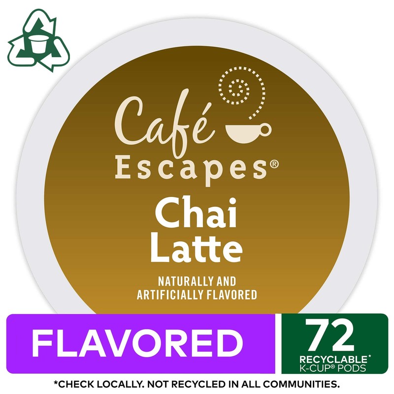 **VARIETY DESCRIPTION:** An extraordinary taste of black tea and exotic spices. From the first taste, you’ll know this is no ordinary tea. Cinnamon and spices mingle with a splash of milky sweetness, turning your daily time out into a relaxing escape to a faraway place of indulgence. Natural and Artificially Flavored, Chai Latte. **ABOUT Café ESCAPES:** Every day, you should do something nice for yourself. Take a break. Relax. Recharge. Give in to a few delicious moments of me time. Café Escapes salutes this notion with a delectable collection of indulgent treats. They're rich, satisfying, and decadent - but not so much that you can't enjoy one every day. Whether you need an afternoon pick-me up, or something to go with that hard to put down book, Café Escapes is the perfect companion. Prepare a cup just for you and enjoy a moment of uplifting downtime. **INGREDIENTS:** SUGAR, CREAMER (HYDROGENATED COCONUT OIL, GLUCOSE SYRUP, SODIUM CASEINATE (FROM MILK), SODIUM POLYPHOSPHATE, DIPOTASSIUM PHOSPHATE, SODIUM STEAROYL-2-LACTYLATE, SILICON DIOXIDE), NONFAT MILK, INSTANT COFFEE, MODIFIED FOOD STARCH, SALT, CARAMEL COLOR, NATURAL AND ARTIFICIAL FLAVOR, SUCRALOSE. CONTAINS: MILK **FOR BEST RESULTS:** 1\. Store at room temperature. 2\. Use the 8-oz. setting on your brewer. 3\. Run a hot water brew cycle (without a K-Cup pack) after brewing Café Escapes. WARNING: NOT FOR USE BY CHILDREN WITHOUT ADULT SUPERVISION. Potential for exposure to very hot liquid. **PACKAGING CHANGE:** In the next few months you may notice a change to the K-Cup pack lids. We have provided an image of the current K-Cup pack lid design, as well as the new K-Cup pack lid design. Please note the product ingredients have not changed.