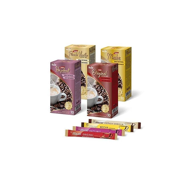 - Rich Variety of Flavors: Indulge in Café Mazel’s 3-in-1 Instant Coffee Variety Pack, featuring 40 convenient sticks with four delicious flavors: Original, Mocha, Hazelnut, and French Vanilla. Each stick is perfectly portioned to provide a café-style coffee experience in seconds.