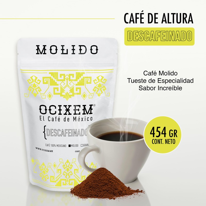 Café Molido Descafeinado OCIXEM 454g | Notas de Cacao y Caramelo | 100% Arábiga Tostado Medio Oscuro | Proceso Swiss Water Libre de Químicos | Certificación Kosher | Ideal para Cafeteras
