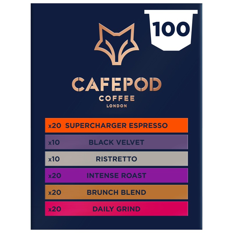 - Assortment of Great Taste Award Winning CAFEPOD coffee pod blends; This bundle includes 10 packs of our 10 x 5.5 grams premium coffee capsules: supercharger (2x 10 Pack), Intense (2x10 Pack), Brunch Blend (2x 10 Pack), Daily Grind (2x 10 Pack), Black Velvet (1x 10 Pack), Ristretto (1x 10 Pack)