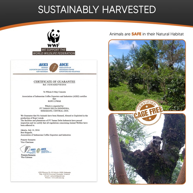- CERTIFIED CRUELTY FREE and sustainably harvested in small batches, 100% of Cafes Granell civet coffee kopi luwak beans come from free range wild Luwaks living a healthy life so you can enjoy our ethically sourced Indonesian coffee beans –No animal has been harmed or exploited in any way in the production of this kopi luwak whole bean coffee.