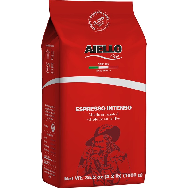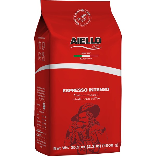 Aiello Caffe Italian Espresso Coffee Beans 2.2 LB Bag, Medium Whole Bean Coffee Freshly Roasted and Blended in Southern Italy, Intenso
