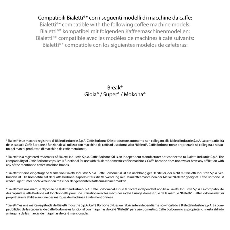 • Bialetti is a registered trademark of Bialetti Industrie SpA. Caffè Borbone Srl is an independent manufacturer not connected to Bialetti Industrie SpA. The compatibility of Caffè Borbone capsules is functional for use with Bialetti domestic coffee machines