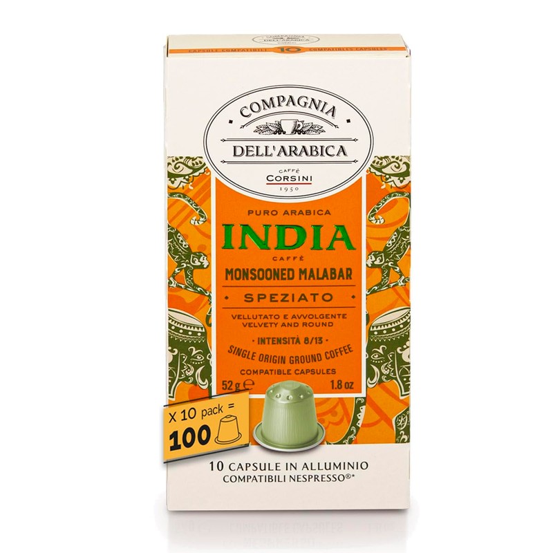 Caffè Corsini Compagnia dell'Arabica, Aluminium Coffee Capsules, Compatible with Nespresso Machines, India 100% Arabica Intensity 8/13, 520g, 10 Packs x 10 Capsules in Each Pack